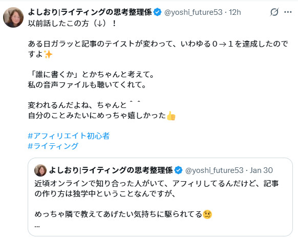 他のプラットフォームでやり取りしていた方が、いわゆる「0→1」を達成したと聞いてメチャクチャ嬉しくなったんですよね\(^o^)/
